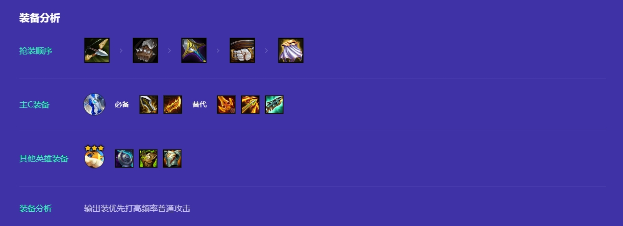 不屈之枪需要反甲+狂徒+救赎三件套,铸星龙王必备青龙刀和法爆;斗射卡莎的核心装备是无尽+轻语+红霸符,前排加里奥则要狂徒+板甲;人造人龙的小法依赖蓝buff和科技枪,龙女需要板甲+离子火花。散件装备尽量合成即时战力强的成品,比如日炎、离子火花前期性价比极高。选秀阶段要针对性抢装备,血量低时优先拿核心装,血量高则考虑拿铲子或未来装备。